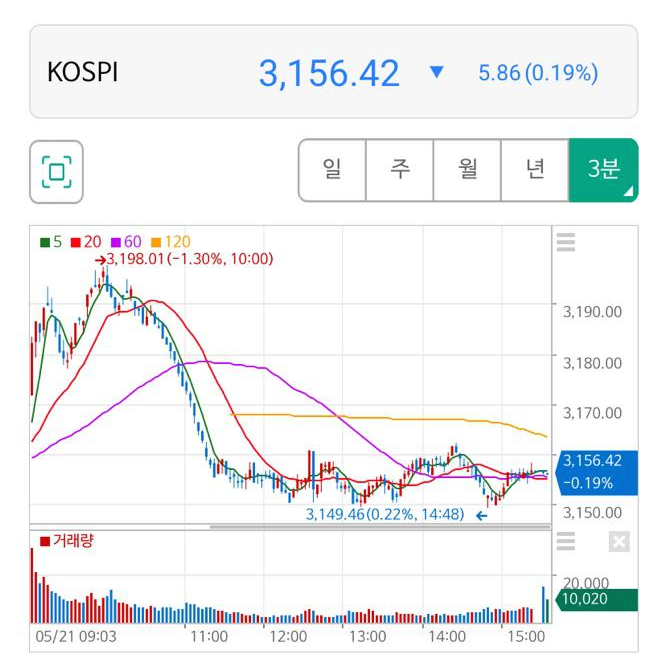 오늘 코스피, 코스닥 3분 봉인데..
